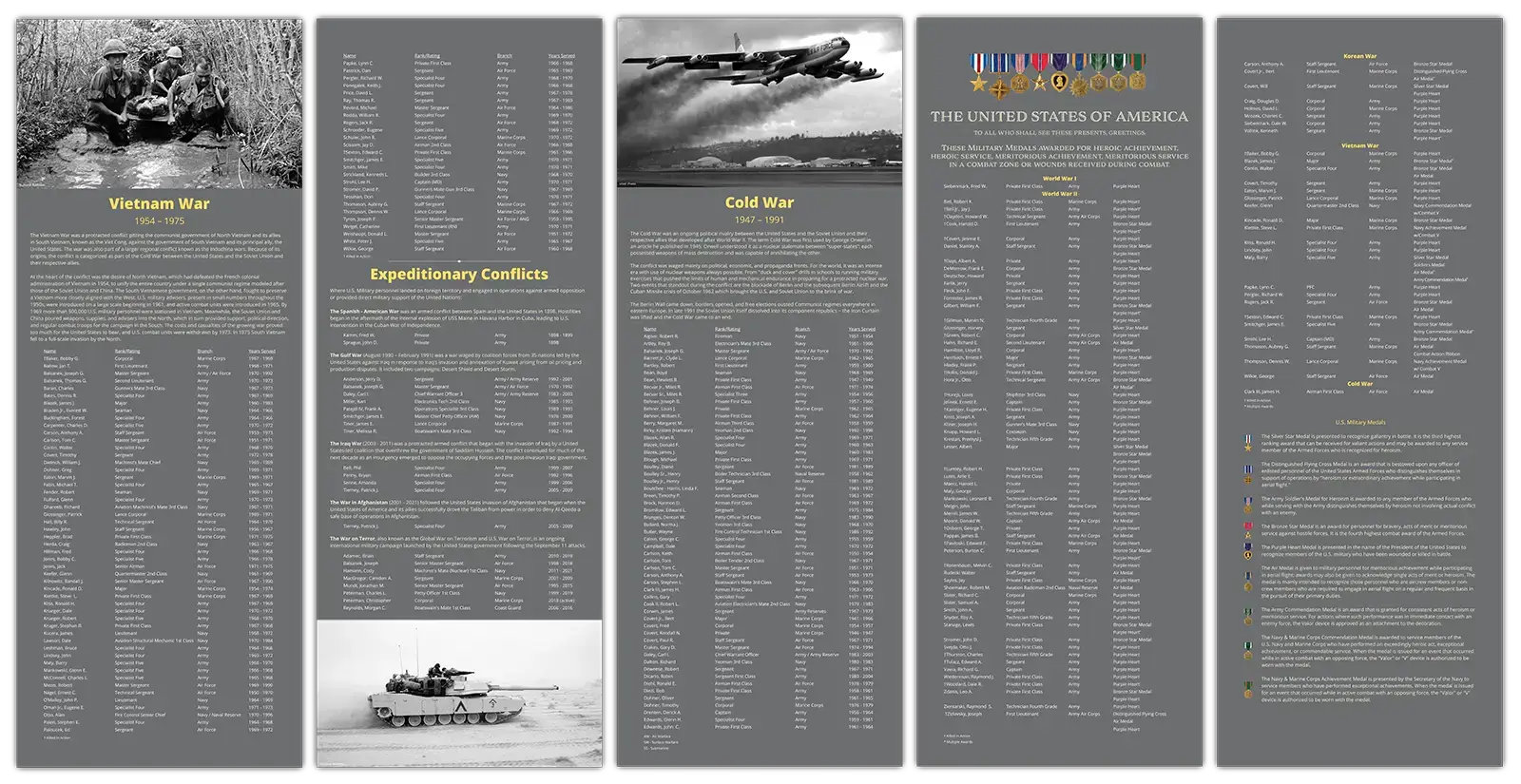These panels, which pay tribute to the men and women who have served in the uniformed services and have a connection to New Buffalo, Michigan (whether they lived, worked, or attended New Buffalo Area Schools), are part of a permanent exhibit at the New Buffalo Railroad Museum. Over 1,200 individuals are listed, by conflict, dating back to the Civil War.